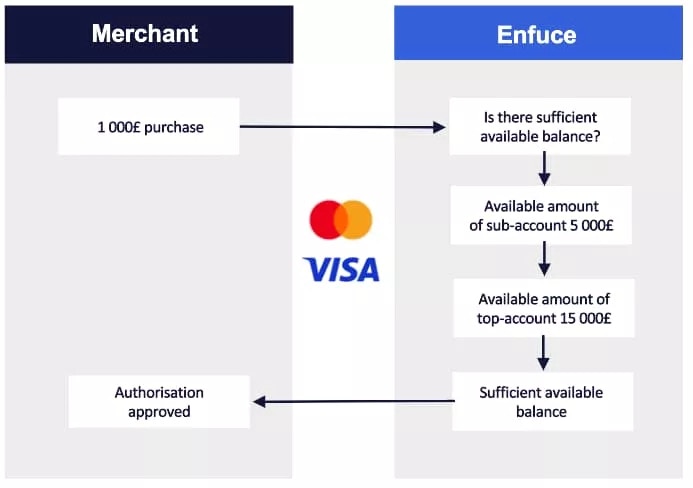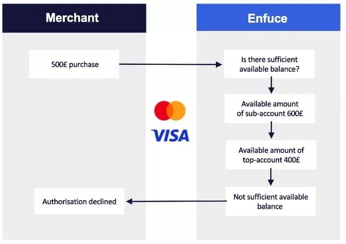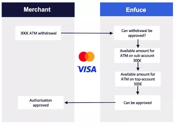 - Sub account A makes a £300 withdrawal → Top account spend control updated to £200 ATM withdrawals left for the day